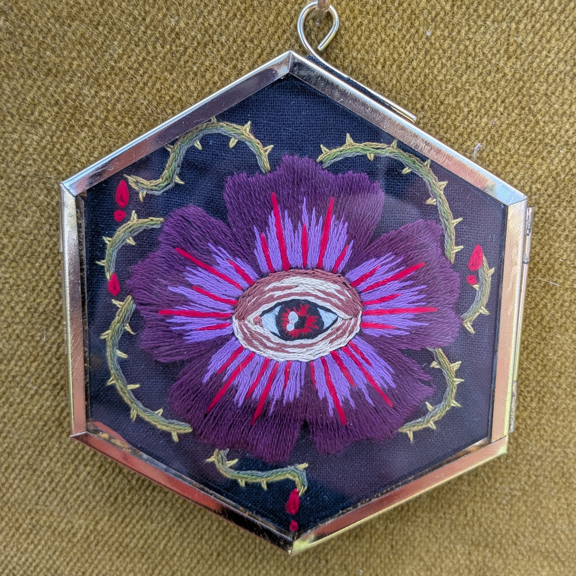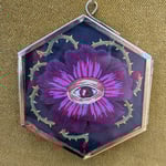 Purple and red flower + black/purple/red eye + thorns w/ drops of blood.